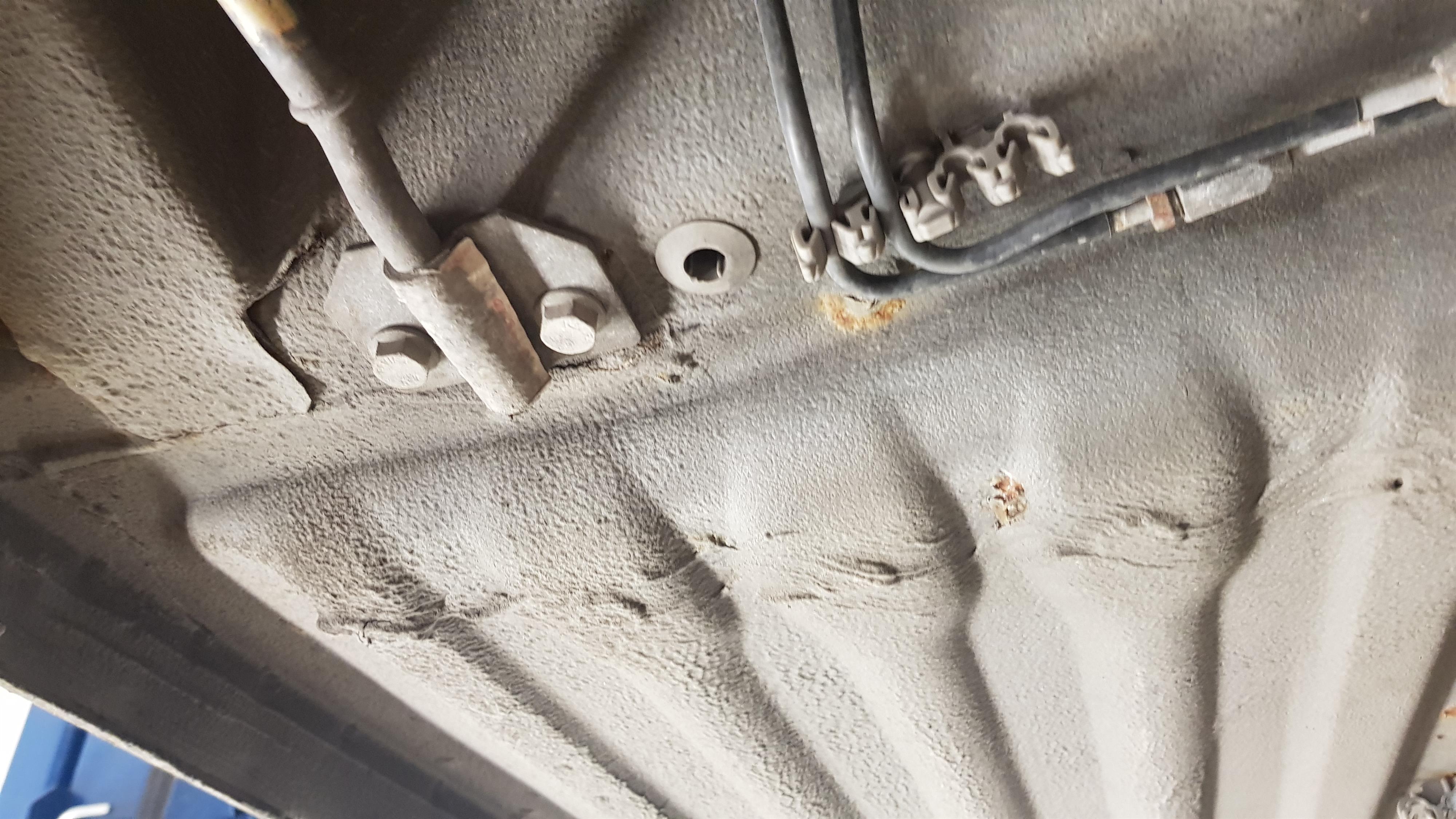 Förra ägaren hade hissat upp bilen och fotat underredet när han lade ut bilen på Blocket. Förtroendeingivande och sympatiskt. Jag visste därmed att bilen var generellt frisk undertill, men rostskyddsmedlet som Alfa sprutade dit på fabriken är nu 22 år gammalt, och har börjat släppa på sina ställen. Där det släpper och flagnar kryper det in fukt undertill, och om man inte är försiktig kan det sluta med att man har ett mycket tunnare golv än man tror sig ha. Som vi alla vet är det också lömskt med balkar som saknar invändigt rostskydd.
