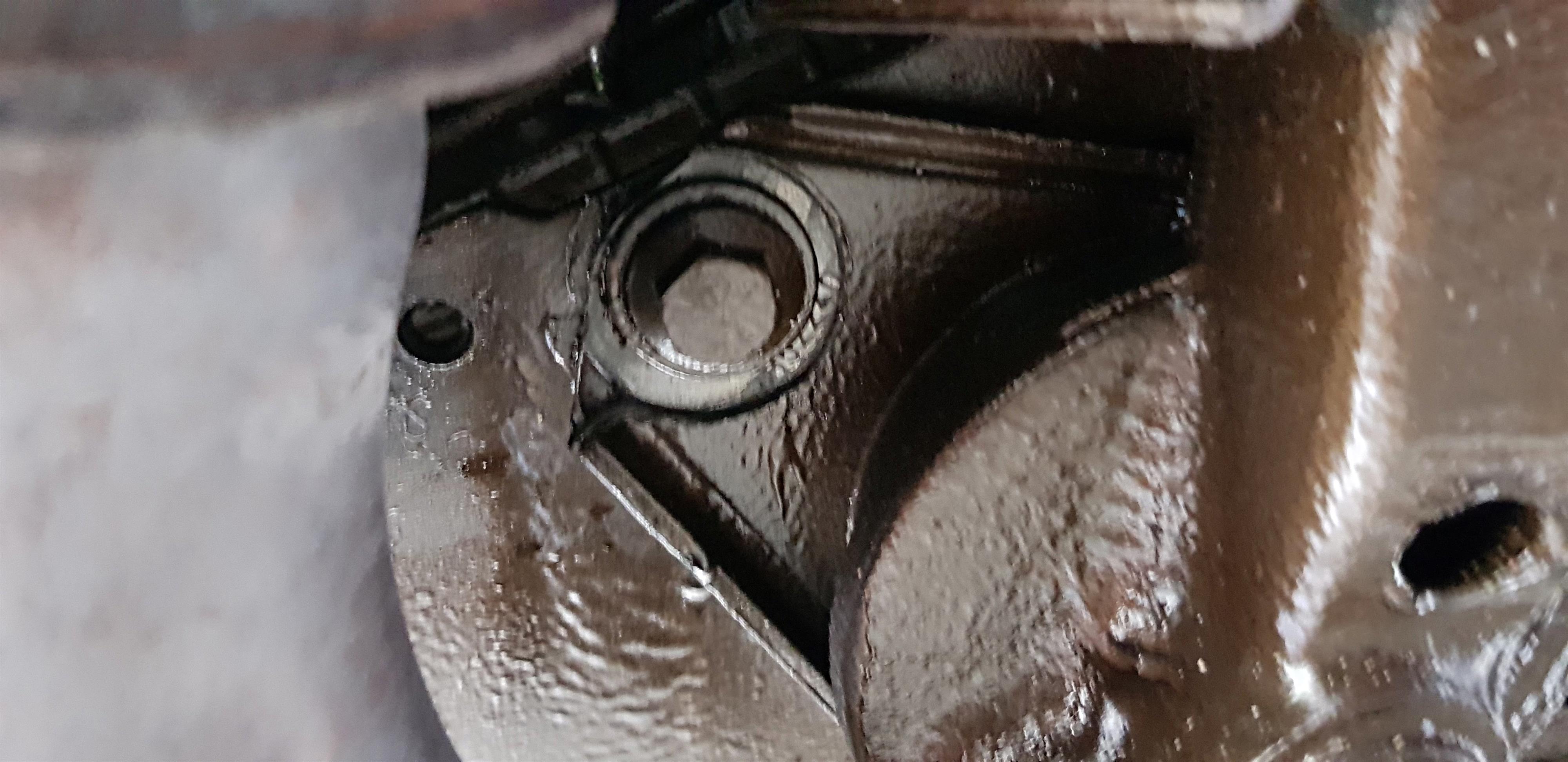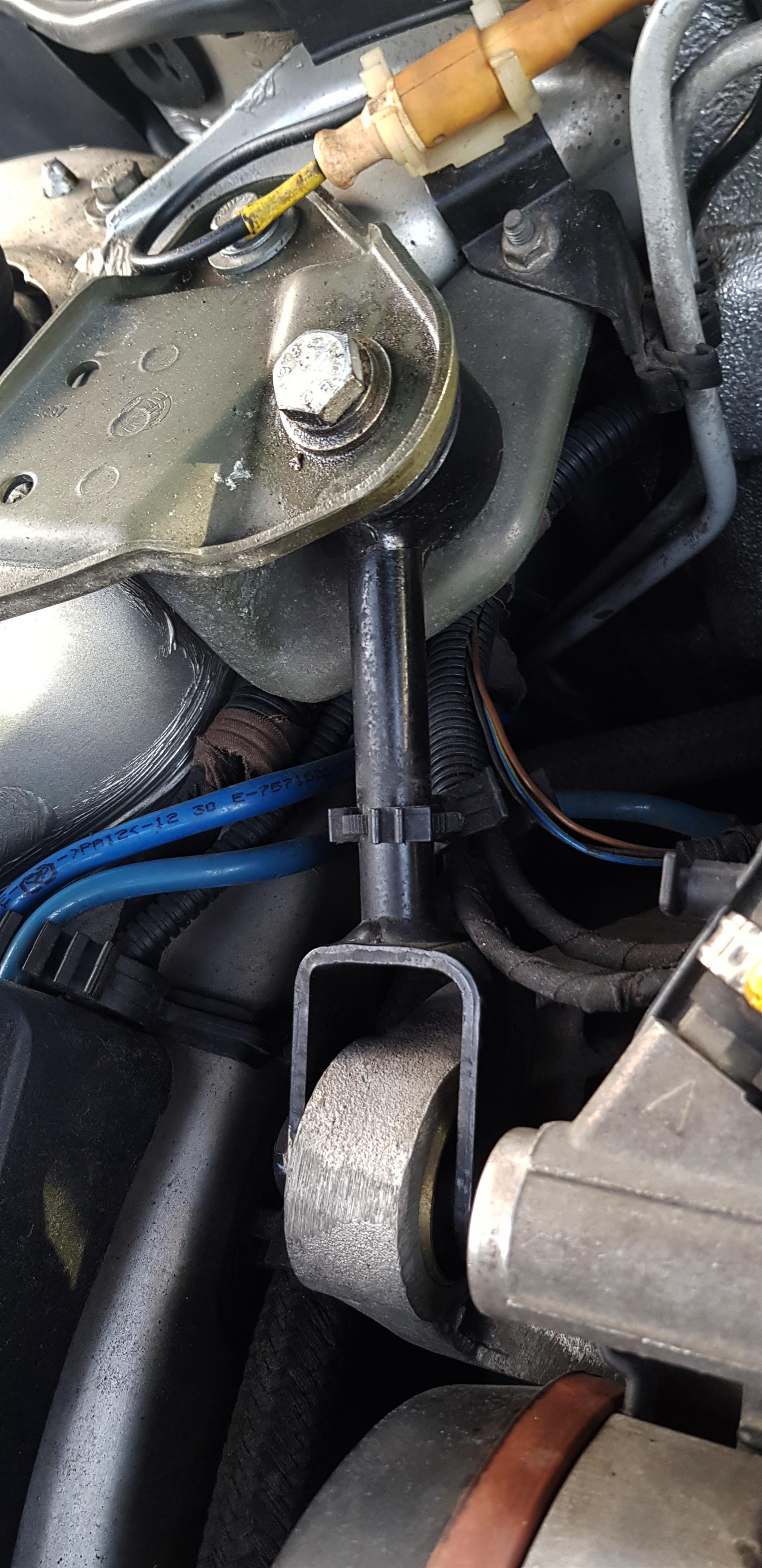 Väl under bilen insåg jag att felet inte var ett trasigt motorfäste. Skruvarna som håller det var inte spända! Fästet sitter fast med M8-skruvar i något överdimensionerade hål, så när dessa inte var åtspända kunde motorfästet förflytta sig några mm i längsled. Följande bild är illa fokuserad, men man kan se på det nya dinitrollagret att brickan har rört sig en del.
