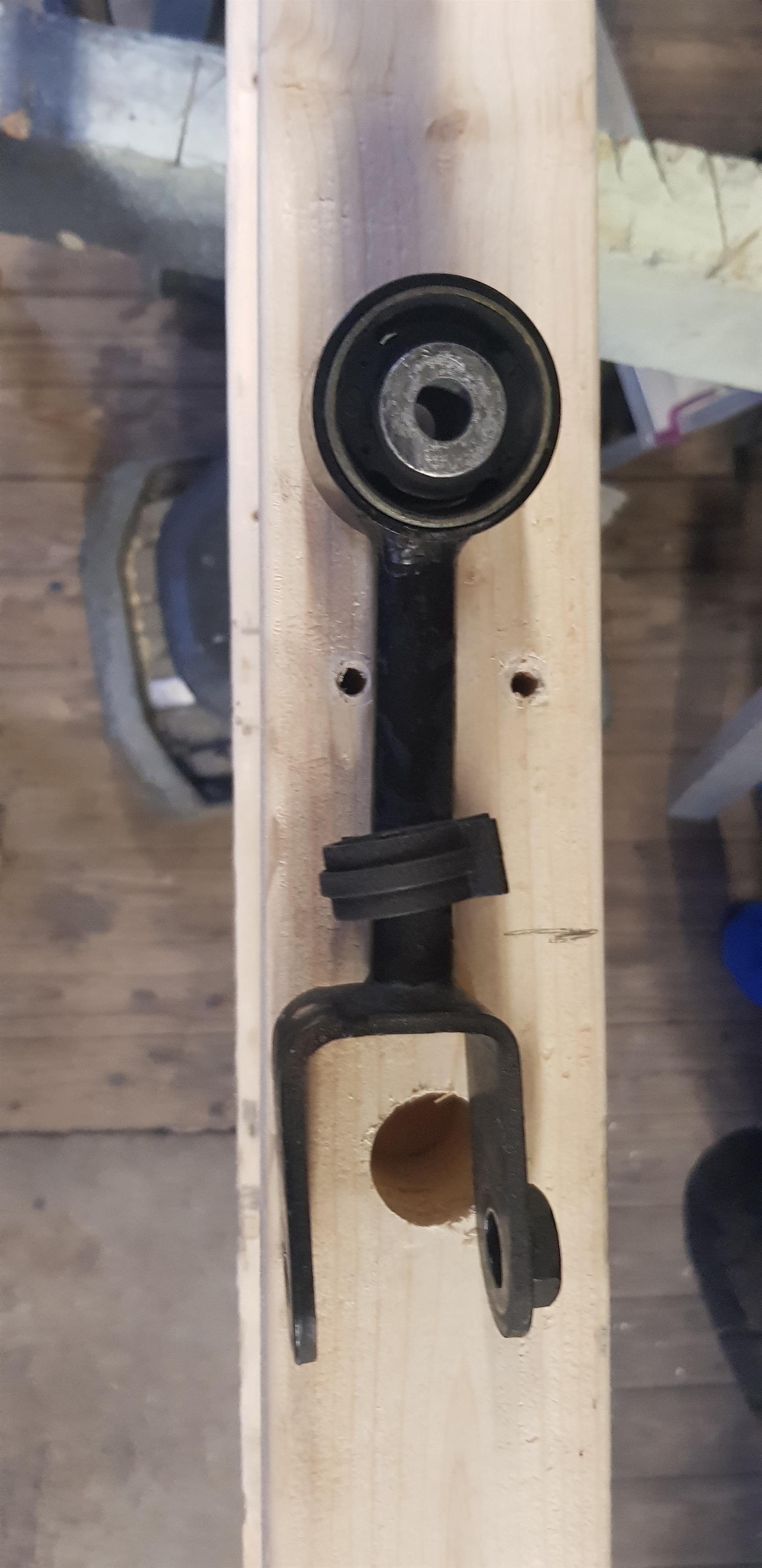 När staget hade levererats noterade jag att bussningen var helt korrekt, men att själva staget var ca 1 cm kortare än det som satt på min bil. Jag vill ogärna ha en motor som sitter i spänn på det viset och lägger permanent last på gummibussningen, så det blev att damma av min fars press och flytta över den nya fräscha bussningen från det nya staget till det gamla. Själva staget kan jag nog göra någon sorts julgranspynt av till nästa år.
