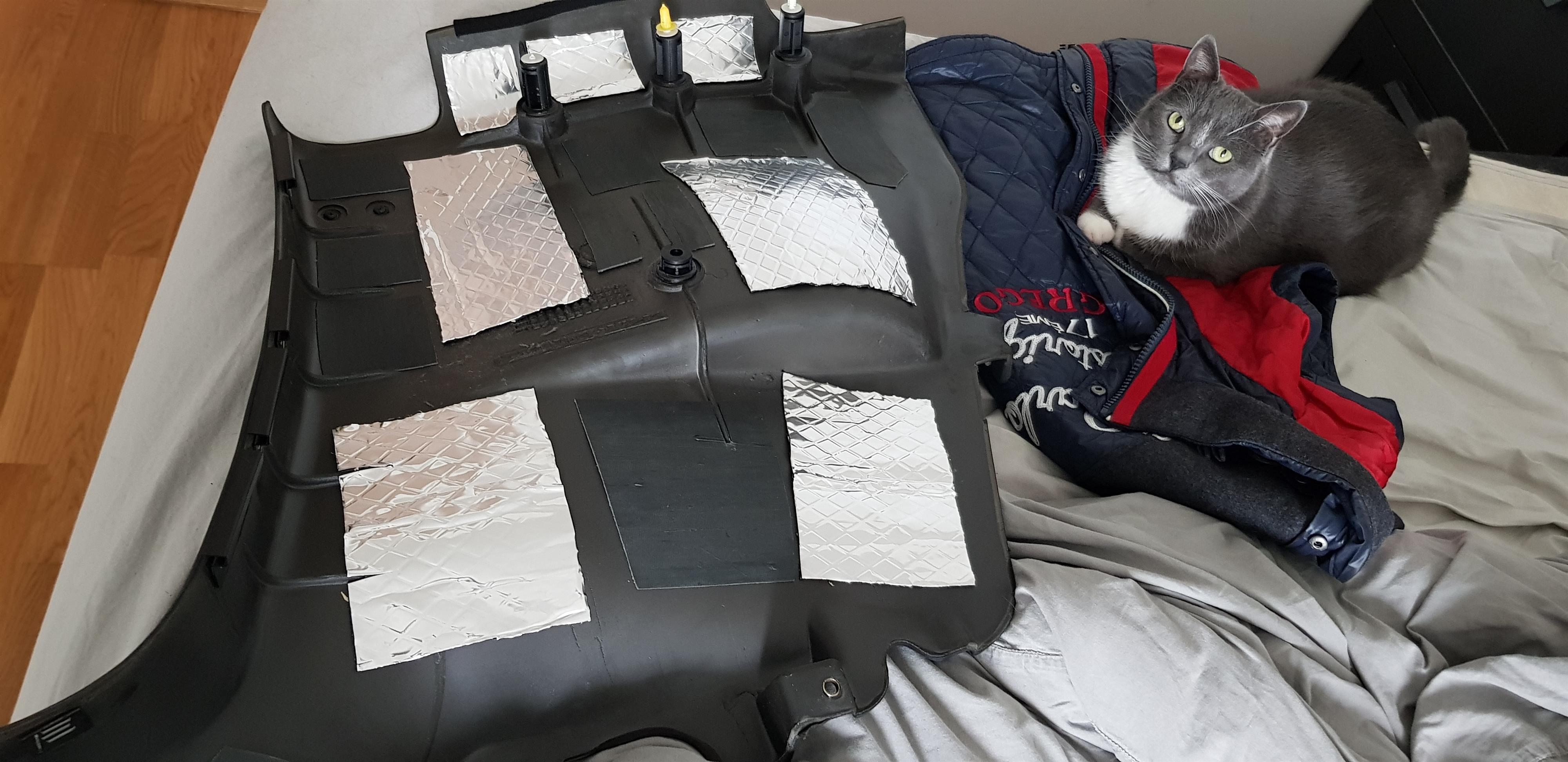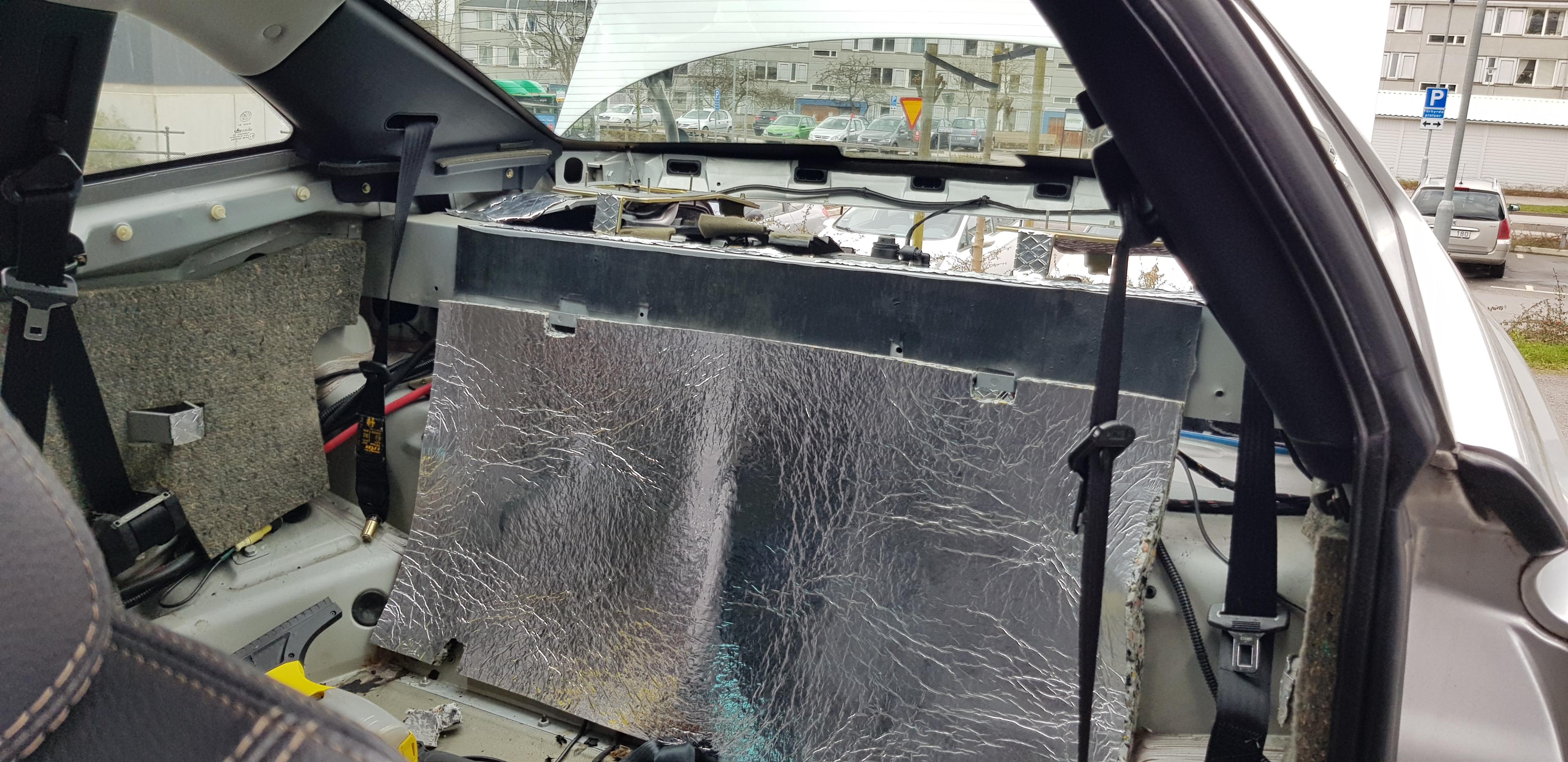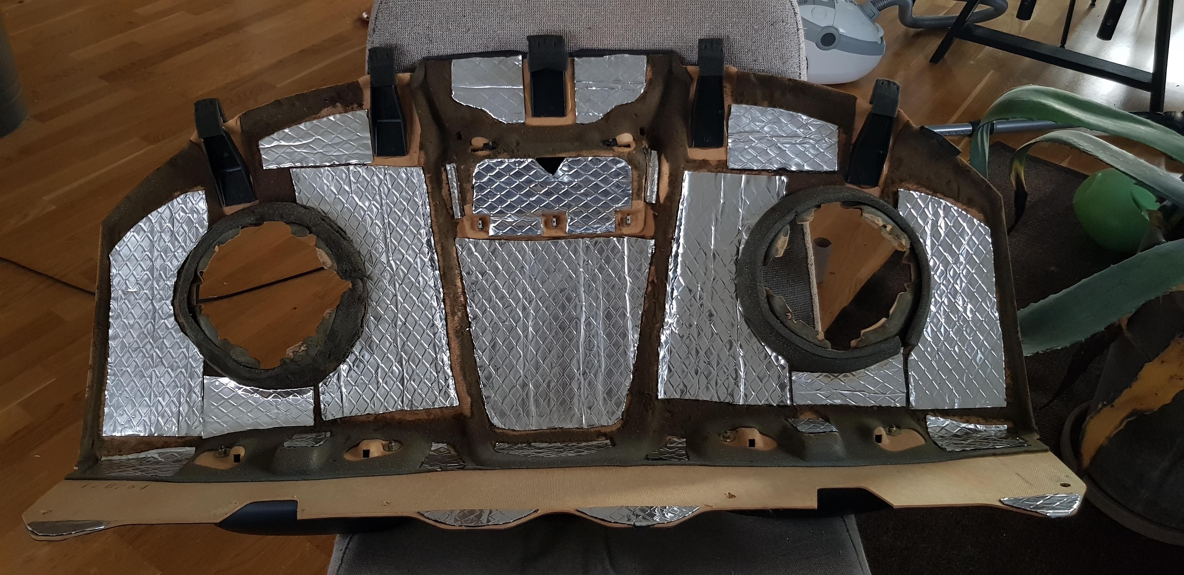 8 mars, 2020 kl. 23:25 #49469Dagen efter: Ny ljudisolering. Tjock bitumenmatta på undersidan av högtalargallren och ett par andra strategiska ställen. Tunnare bitumenmatta på ovansidan, på tvärbalken och på andra platser där jag inte var säker på hur mycket fri volym som finns när allt är monterat. Jag täckte även undersidan av hatthyllan med bitumen, gissar att den blev ungefär dubbelt så tung.
