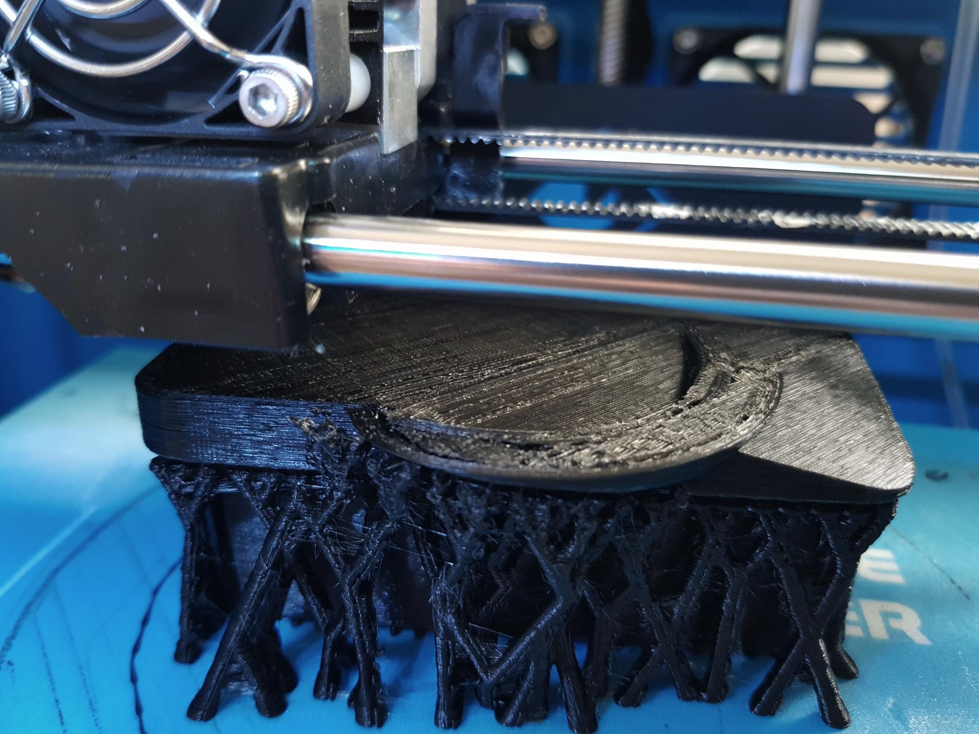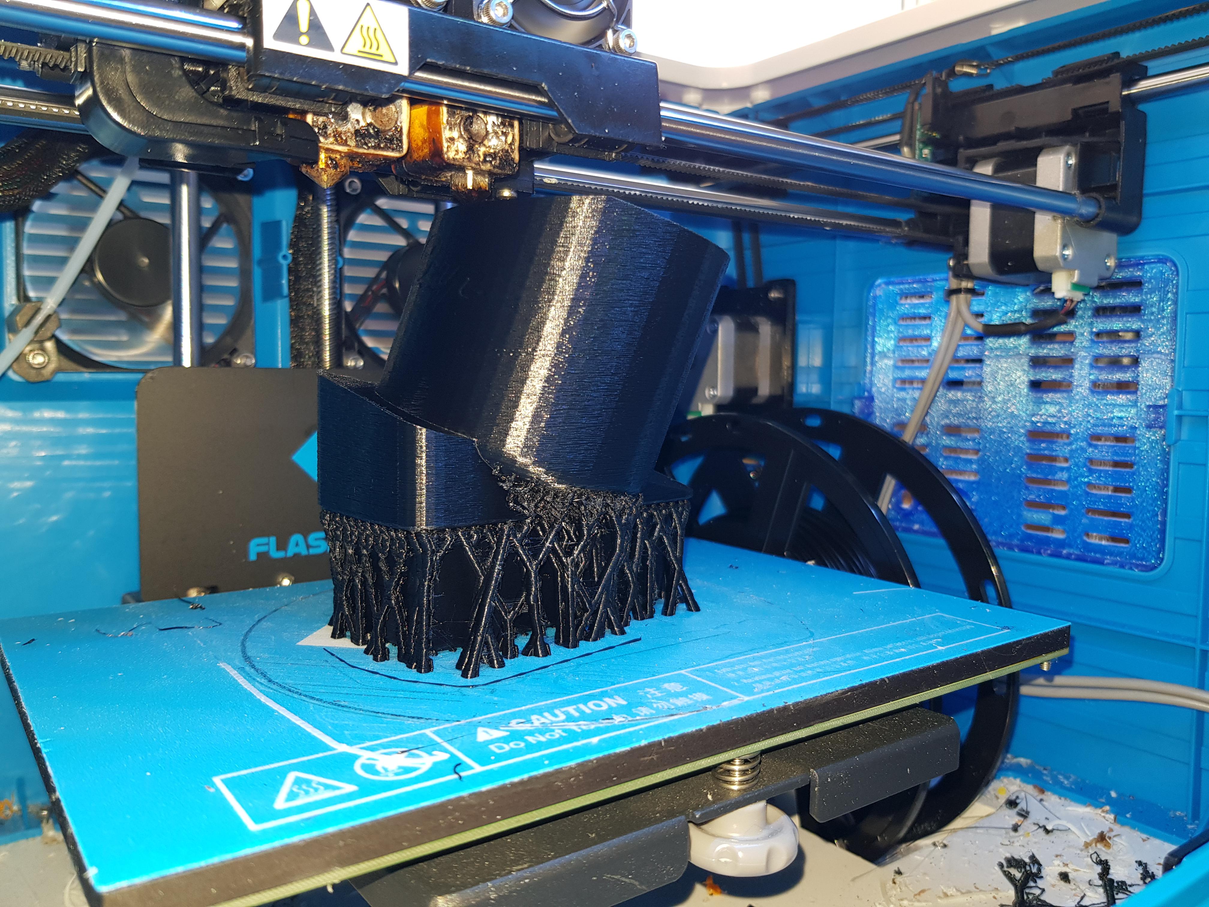 När jag väl hittade en horisontell yta modellerade jag upp en hållare i PLA-plast, av rimlig diameter för de storlekar på bensinmacks-kaffe som jag normalt köper. Jag printade även upp distansklossar för insidan, för att kunna hålla mindre burkar och flaskor så stadigt som möjligt.