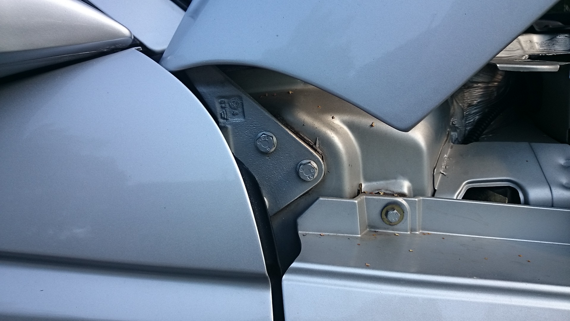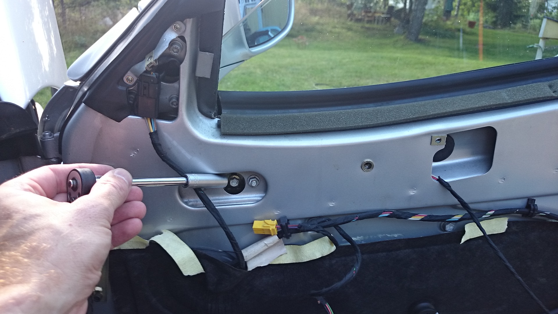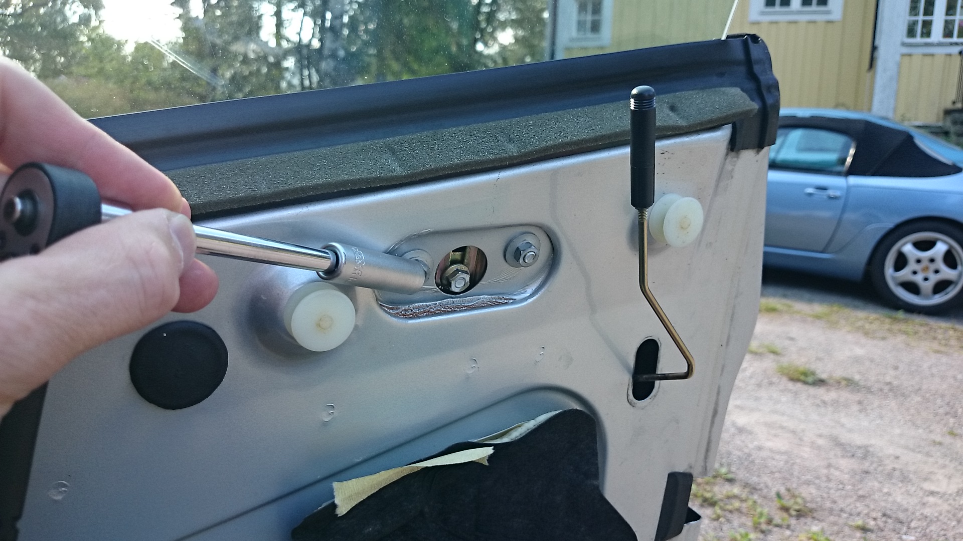 Förra veckan var Filip förbi för att få hjälp med en litet elfix på hans 166a, och skarpögd som han är så påpekade han att passagerardörren hängde ned i bakkant på min bil. En surdeg som hängt med ända sen jag köpte bilen, men som jag inte fått tummen ur och fixat. Idag var det dags! Jag hade noterat att man kunde se på det övre gångjärnet (som delar fäste med motorhuven) att fästet var flyttat. Jag lppnade dörren bara så mycket att jag kunde sätta garagedomkraften på dörrens undersida i bakkant och stötta den där. Sedan lossade jag fästet och höjde dörren ett par millimeter. Den hamnade bra i läge, men gick nu inte att stänga pga att rutan tog i A-stolpen. Lite påläsning i verkstadshandboken visade att det fanns två justerbara stopp för rutan. Bara att riva ner dörrsidan och justera rutans stoppen, vilket visade sig vara enklare än jag trodde. Slutligen fick jag justera den mottagande låsmojängen på B-stolpen, sen stängde dörren perfekt. Möjligen kan man finjustera rutans läge ytterligare lite i rktning framåt/bakåt, men det får vara till en annan gång.