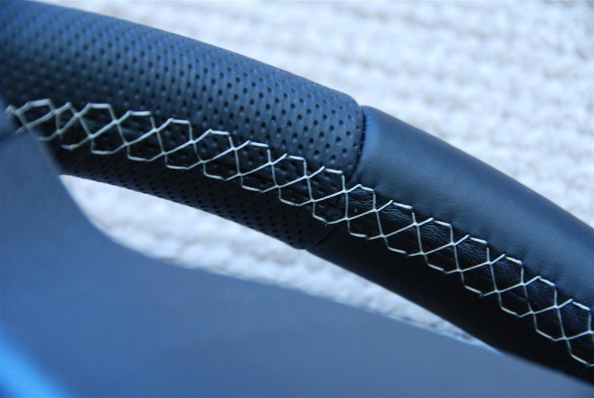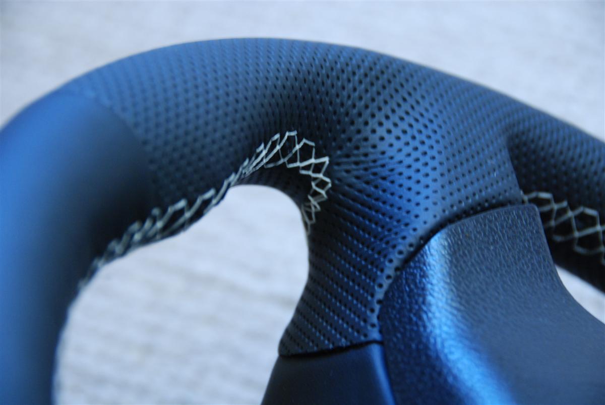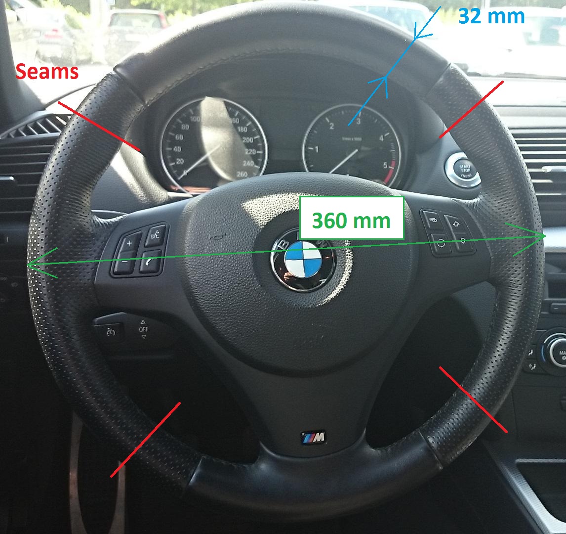 Diametern minskades från ca 380mm till 360mm och greppet tjockades på så det blev lite ovalt med ca 32mm bredd och 39mm djup. Sömmarna flyttades en aning jämfört med BMW-ratten då jag tyckte det var lite mycket perforerat läder på den. Sömmen valde jag att få cremevit för att matcha sömmarna på stolarna i min bil.