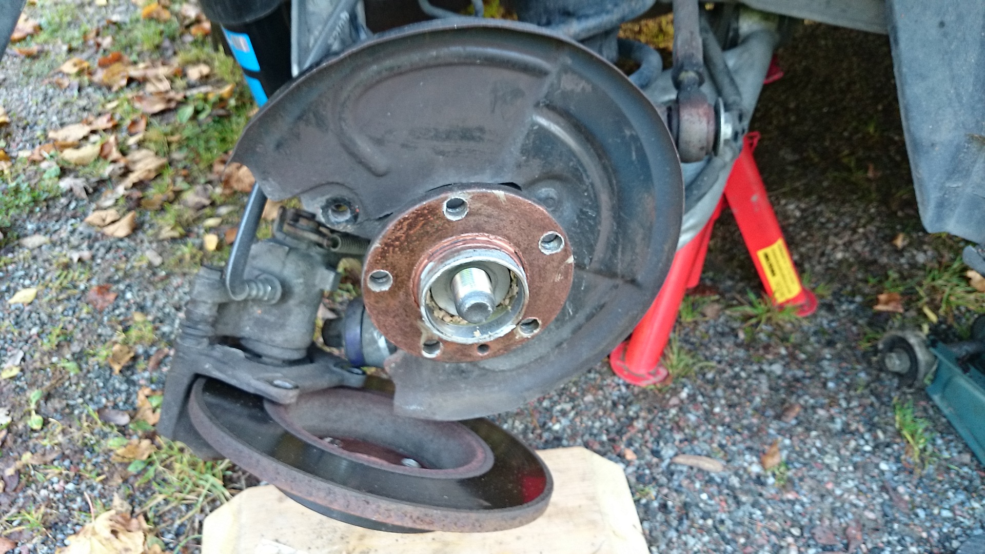 Återmonteringen krävde att jag lånade en momentnyckel på jobbet som klarar upp till 400Nm, eftersom hjullagermuttern skall dras med 266-294 Nm, och det är lite mer än vad standardnyckeln klarar. Annars inga konstigheter. Åtdragning gjordes på samma sätt som lossdragning, dvs. med reservhjulet moterat.Tyvärr löste inte heller byte av bakhjulslager missljudsproblemet, så det var bara att kavla upp ärmarna och ge sig på framhjulslagren. Mer om det senare.