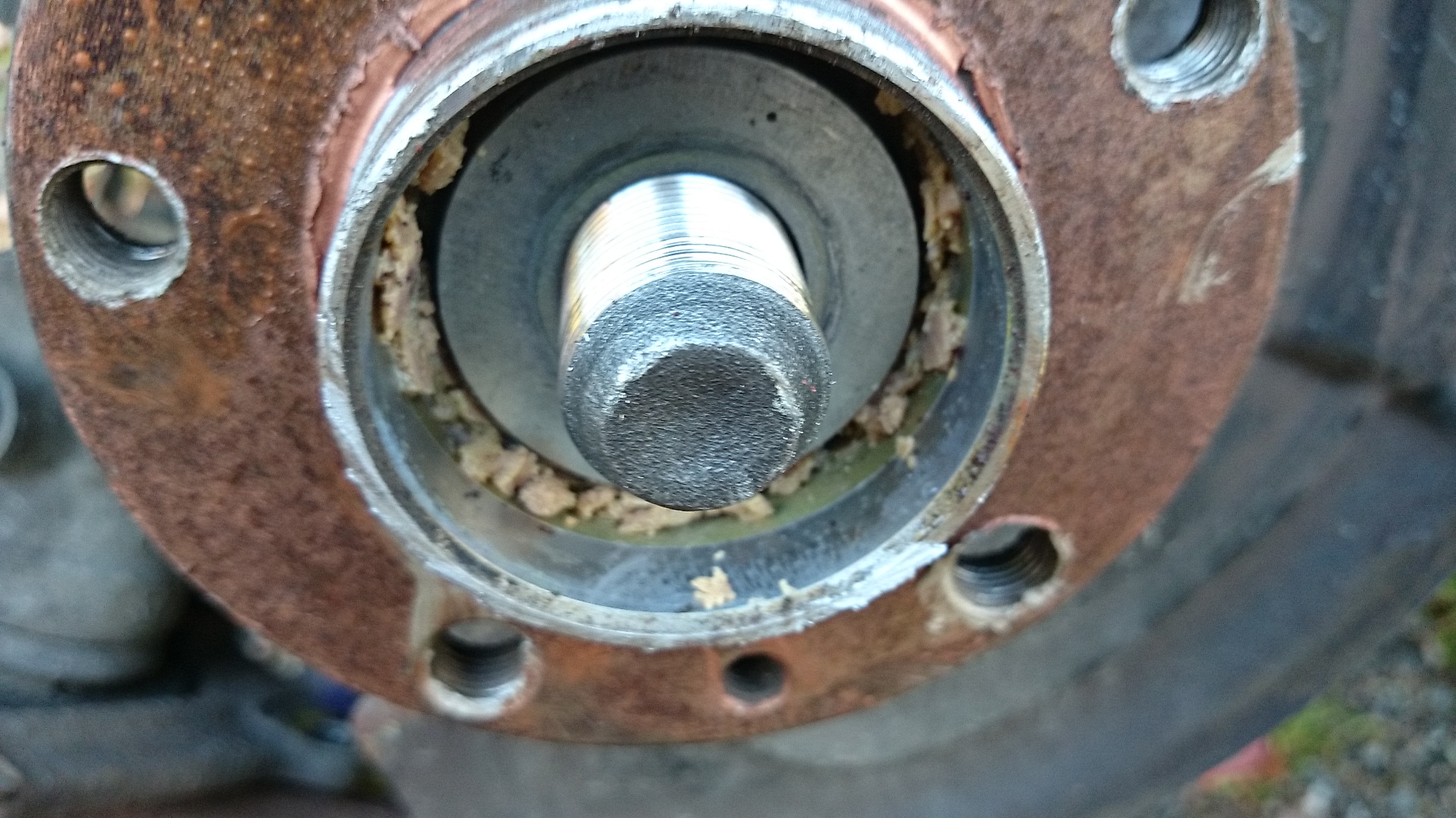 Det svåraste med att byta bakhjulslagren var att lossa muttern till lagret som sitter som intorkat messmör på en smörkniv. Jag var inte så sugen att dra loss muttern med bilen på pallbockar ifall något skulle gå snett, så lösningen fick bli reservhjulet som har en öppning så att man kommer åt muttern. När man väl lossat muttern är det bara att dra av lager och nav (som är en enhet) och sätta dit den nya. Det visade sig att det var nog inte så dumt beslut att byta lagren eftersom fettet i dem hade konsistens som påminde mer om smulpaj än om lagerfett!