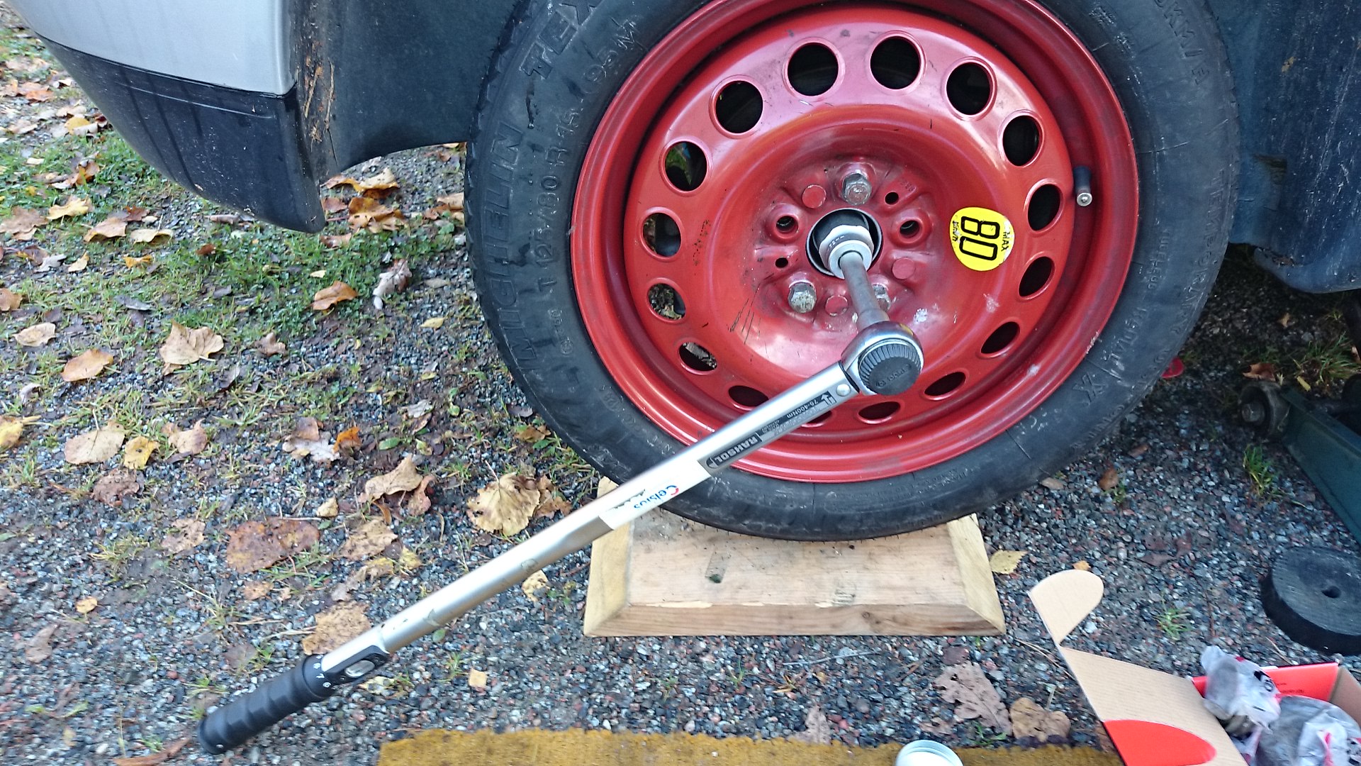 5) Ådragning med massor av Nm.Klossen är för att få upp bilen så domkraften går in.