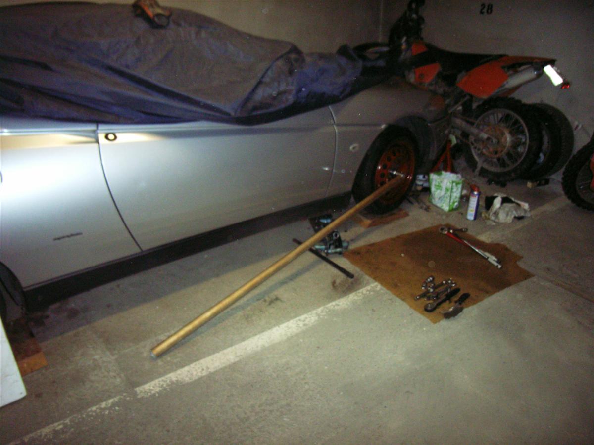 Skruvdragare visade sig vara ett bra verktyg att jobba med när man skulle spänna ihop fjädern för demontering/montering. Toppmuttern lossade jag tidigare med mutterpicka, men för att montera den var jag tvungen att svetsa ihop ett specialverktyg för att komma åt att hålla emot kolvstången på stötdämparen som har en insexa i toppen. Muttern är 22mm för den som vill göra ett eget verktyg.