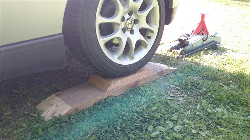 5) Ett enkelt trick jag använder för att få upp bilen lite och komma åt att lyfta med garagedomkraften. Ett par avfasade regelstumpar.
