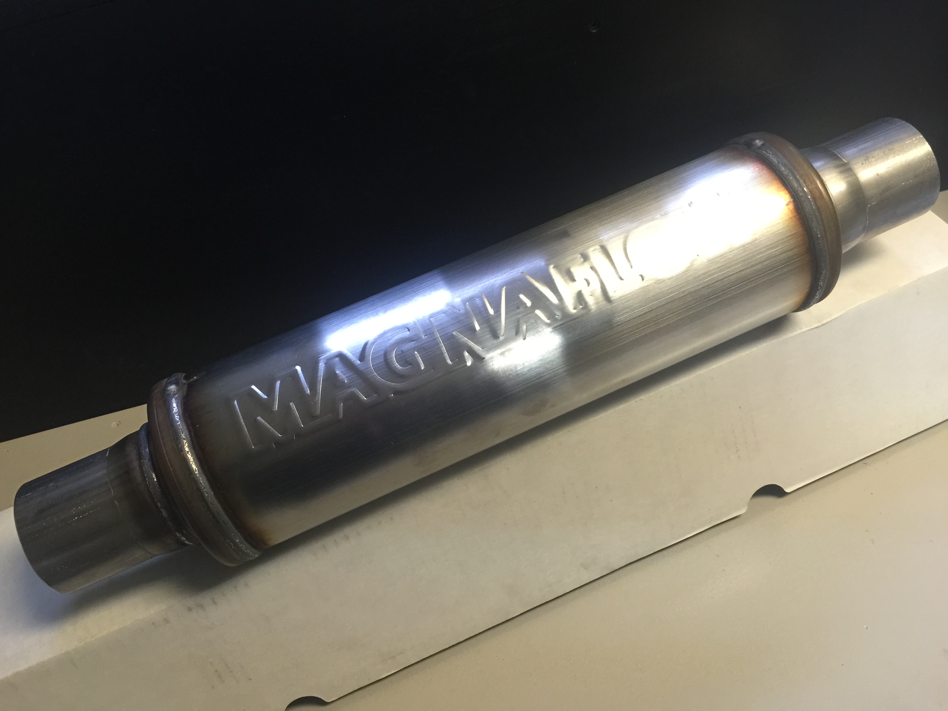 3 mars, 2015 kl. 16:45 #45285Fick lite dåliga vibbar av den 2,25 tums walker-dämparen jag köpt och bestämde mig för att kontrollmäta. 1,9 tum lite drygt blir lite för mycket strypning så idag blev det en vända till Hansen racing för ett byte till denna Magnaflow 2,25 som egentligen är en 2,5 med mindre stosar. Det känns bättre. Imorgon körs bilen till avgasgubben för montering.