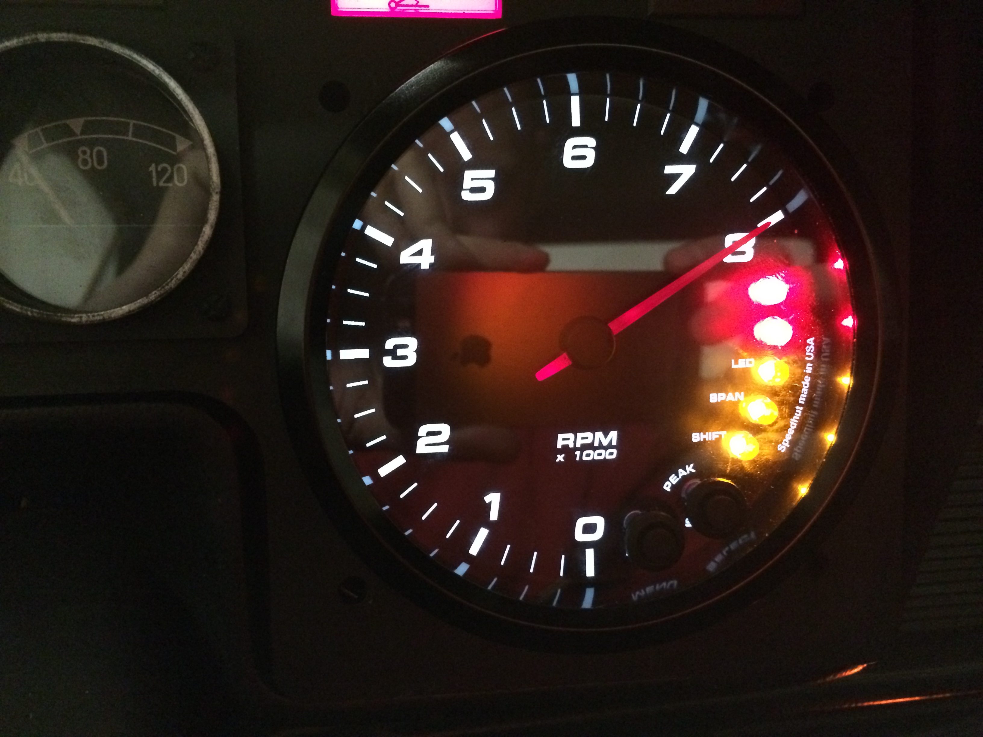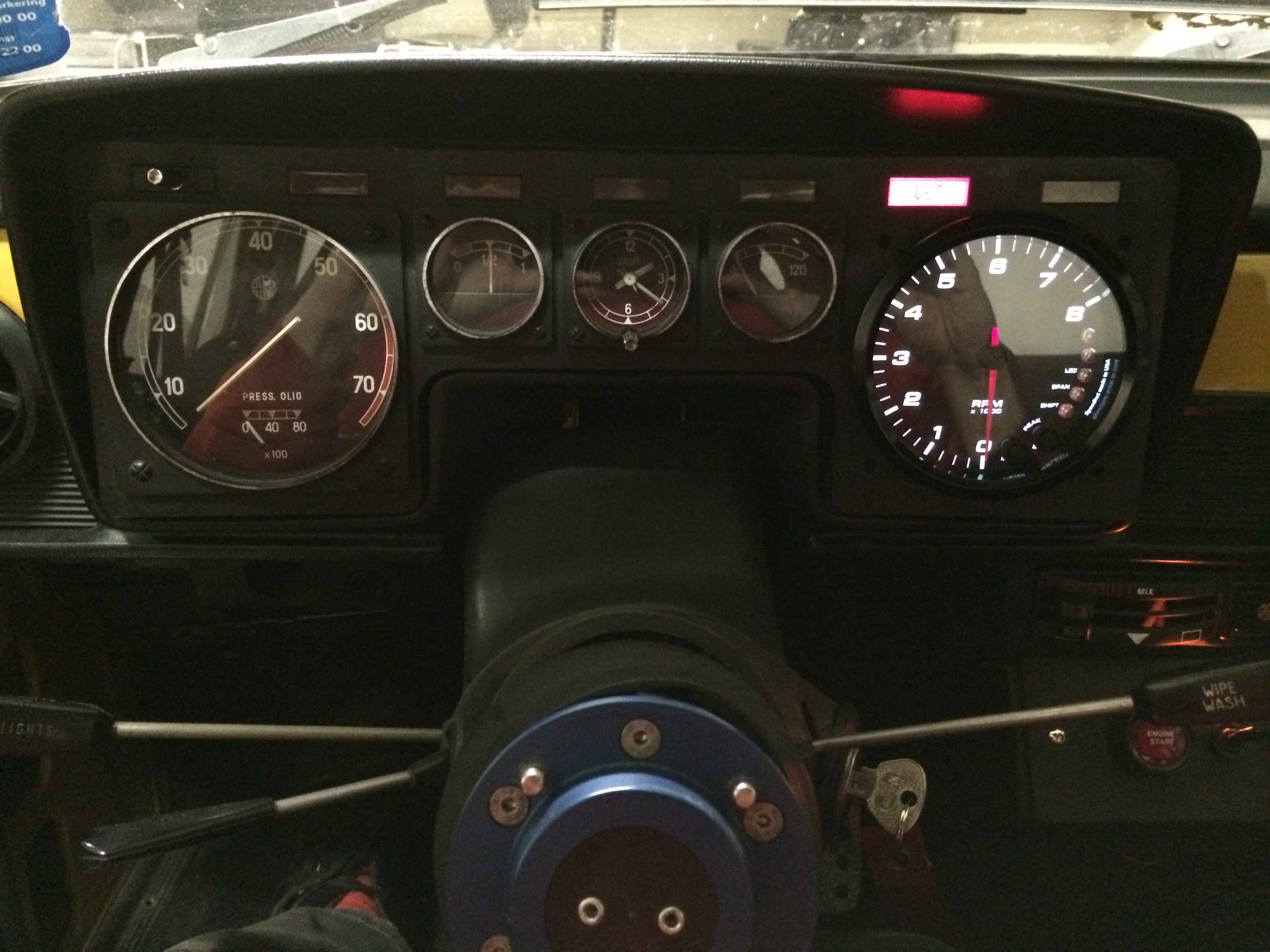 Först hade jag tänkt mig att ha varvräknaren i mitten men hur jag än flyttade runt den kom någonting ivägen. Till slut visade det sig att orginalplatsen för hastighetsmätaren var den som passade bäst. Så hastighetsmätaren fick åka och den nya varvräknaren åkte i och kopplades in. Blev riktigt anständigt och de ställbara växlingsindkeringsdioderna lyser så starkt att man går och blinkar i en kvart efteråt… tack och lov är de ställbara… Det ska bli väldigt trevligt när alla instrument är bytta!
